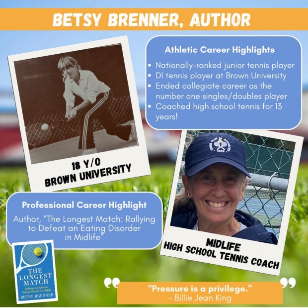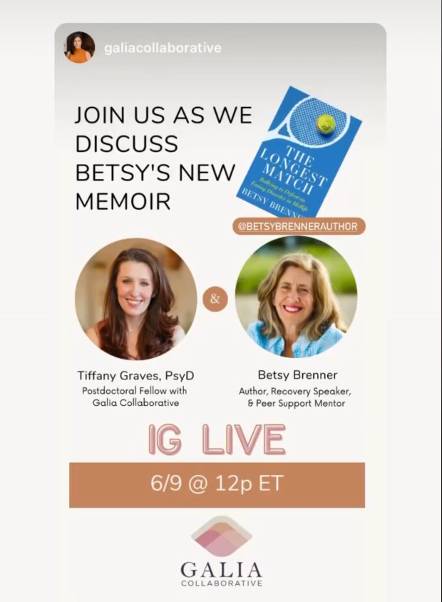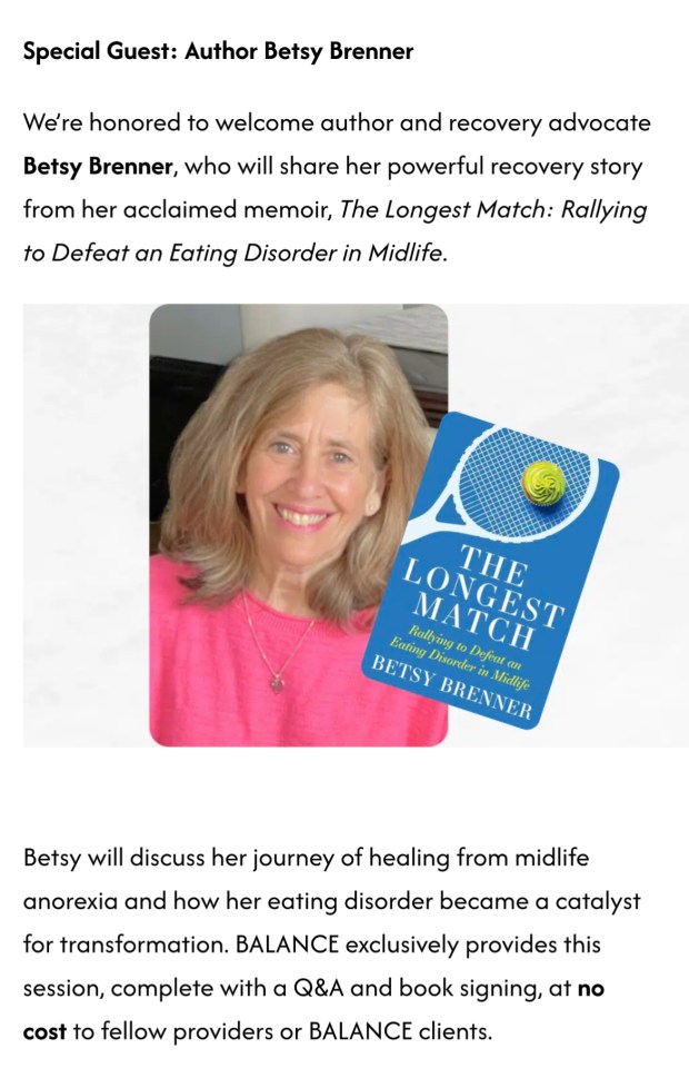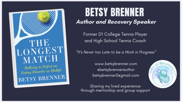 “Betsy shares her story with remarkable authenticity — weaving together her experiences as an athlete, her grief and loss, medical challenges, family dynamics, and her journey as a woman in midlife who developed an eating disorder. She speaks with honesty and courage, while consistently instilling hope that recovery is possible.