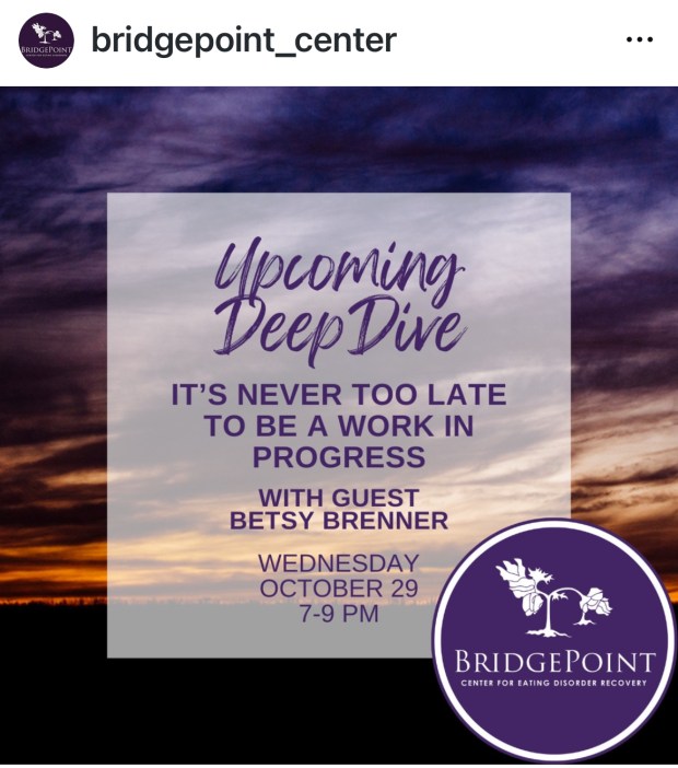 Virtual “Deep Dive” presentation for Bridgepoint Center for Eating Disorder Recovery “It’s Never too Late to be a Work in Progress”- Eating Disorders in Midlife, Saskatchewan, Canada