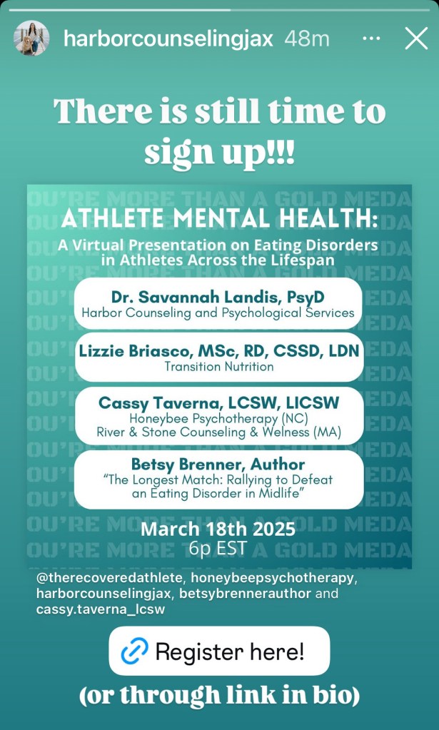Virtual Presentation on Athlete Mental Health: “Eating Disorders in Athletes Across the Lifespan” with sports psychologist, Dr. Savannah Landis, sports dietitian, Lizzie Briasco and therapist, Cassy Taverna